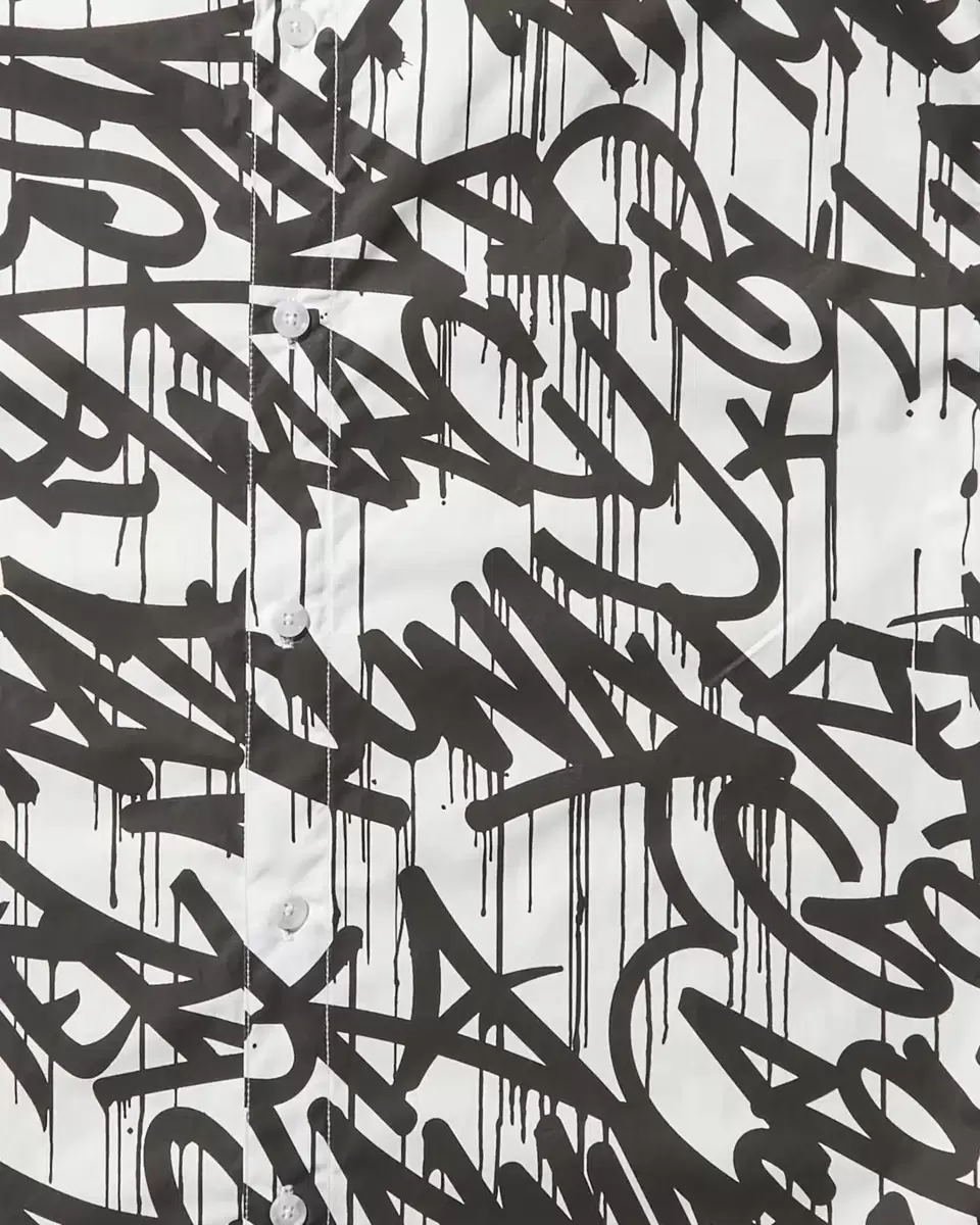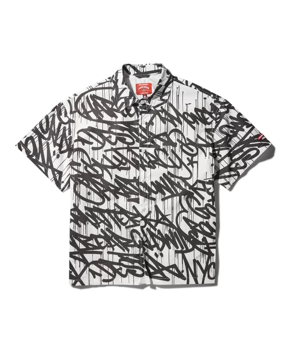 Chiusura frontale con bottoni Stampa del logo su tutta la superficie Logo in gomma con logo Sprayground sull’orlo della manica Nastro verticale con bocca di squalo sul dettaglio del gancio appendiabiti interno