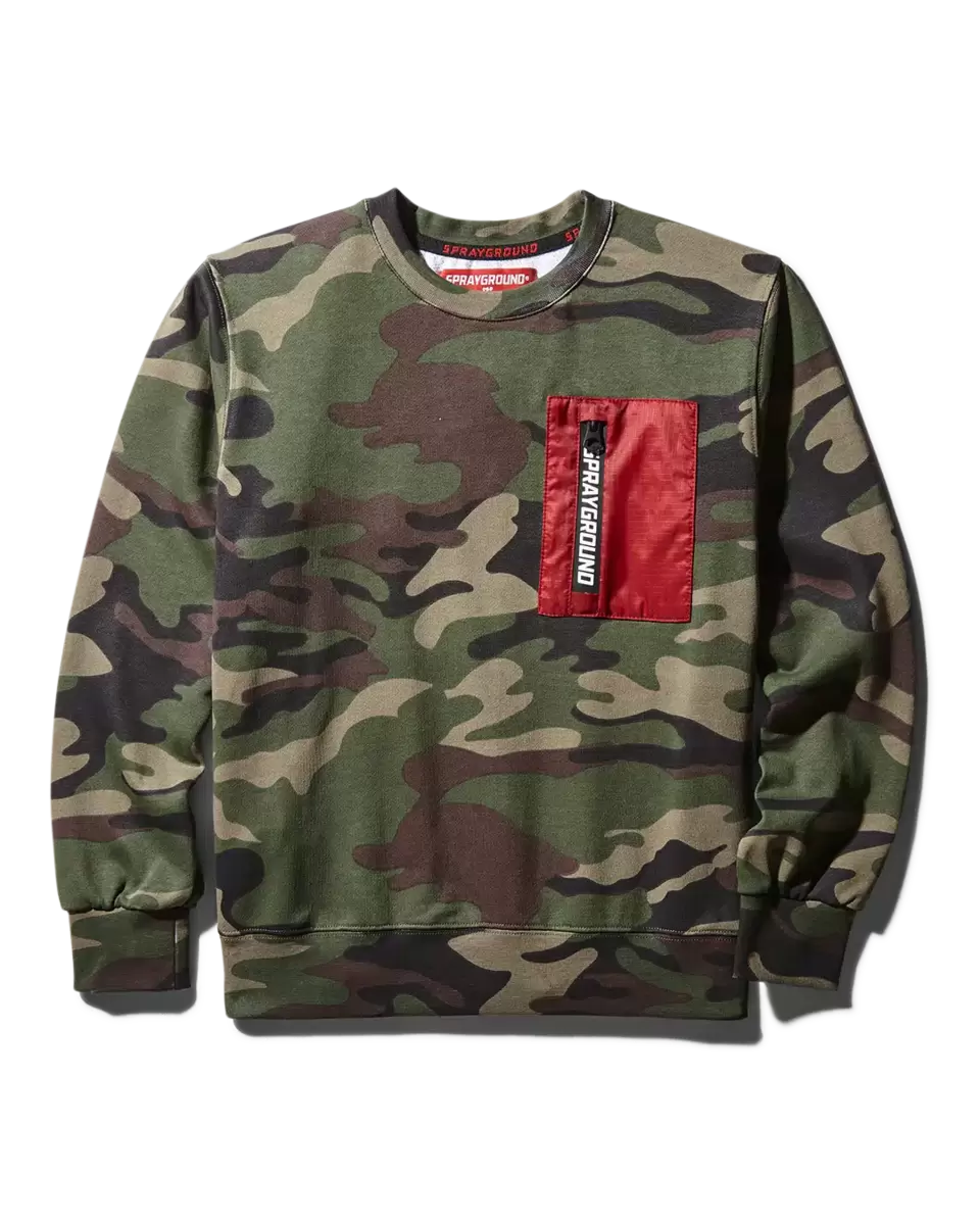 100% COTONE Dettagli MAGLIA GIROCOLLO MIMETICA CON RICAMO POSTERIORE, ANNO DELLA TIGRE, GRAFICA SPRAYGROUND; TASCA ROSSA CON LOGO NERO/BIANCO