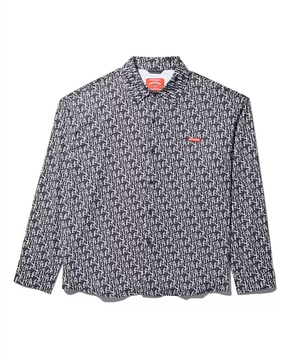 Chiusura frontale con bottoni, polsini con chiusura a bottoni, stampa logo Sprayground su tutta la superficie, logo in gomma con logo Sprayground sul petto, nastro verticale a forma di bocca di squalo sul dettaglio del gancio appendiabiti interno