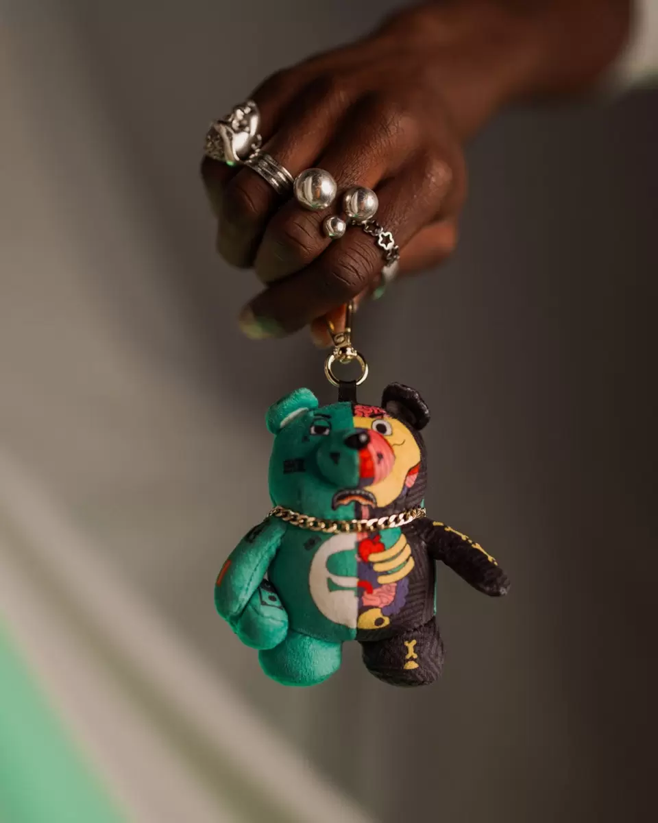 L’accessorio perfetto. Portachiavi a forma di orso di peluche con motivo a scheletro diviso e catena dorata.