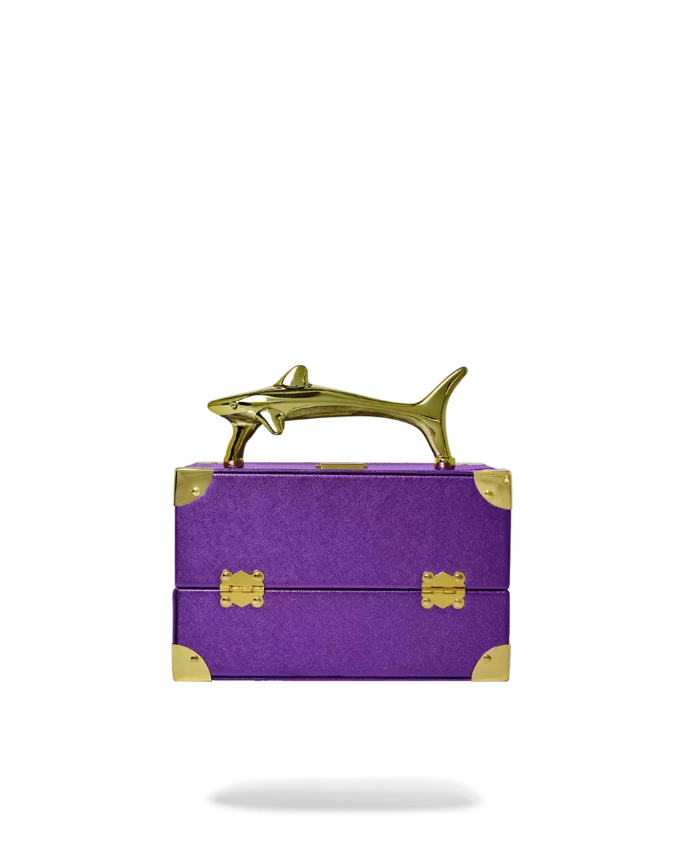 Brilla e risplendi! Portagioielli personalizzato con manico sagomato a forma di squalo, tessuto viola metallizzato e fodera interna in velluto dorato sbriciolato. DETTAGLI DEL PRODOTTO: 100% PVC. Taglia 11.
