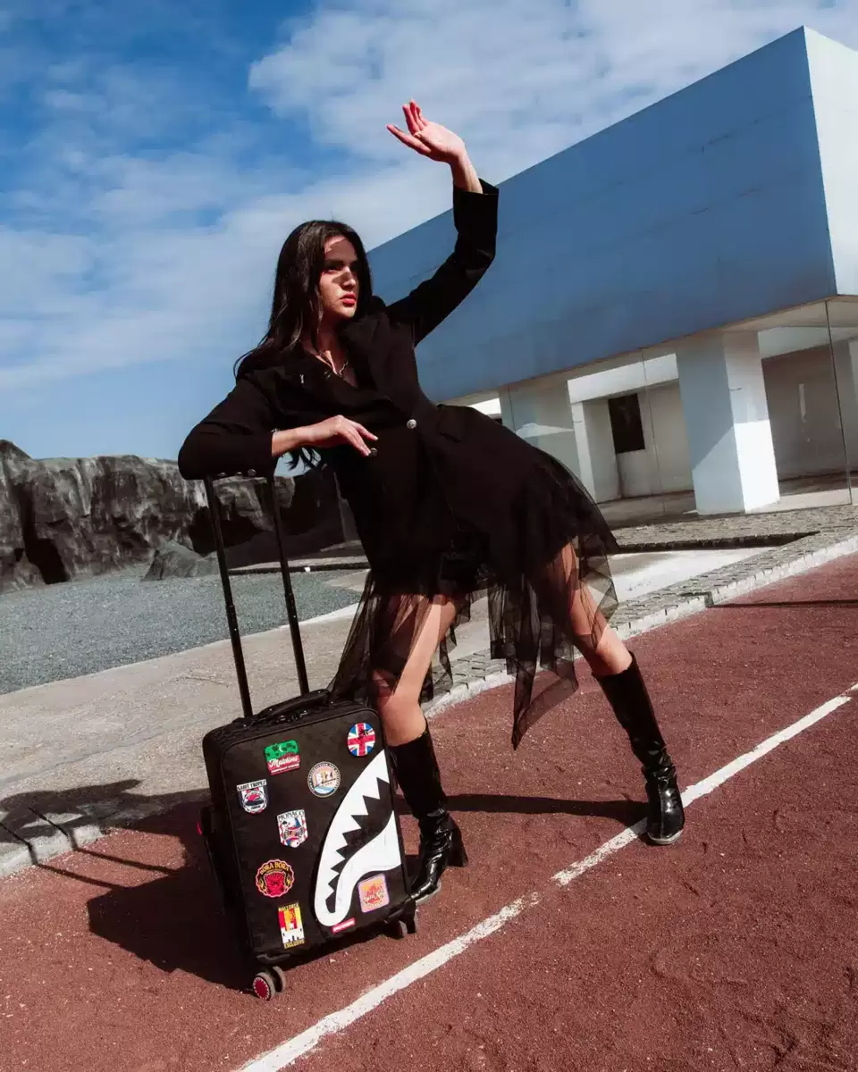 Guscio in cloruro di polivinile al 100%, ovvero 100% similpelle Altezza: 19,5″ x Larghezza: 14,5″ x Profondità: 7″ Telaio con cerniera YKK® Tasca esterna frontale Logo in rilievo Manici superiori e laterali in similpelle 4 doppie ruote girevoli incassate Maniglia telescopica regolabile – 2 posizioni INTERNO: Molteplici tasche e scomparti per la massima organizzazione 3 tasche con cerniera 4 tasche in rete Fodera in raso con stampa squalo Tasche organizer in rete Cinghie di fissaggio Cerniere in nylon con hardware in metallo