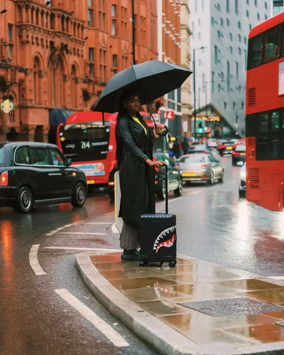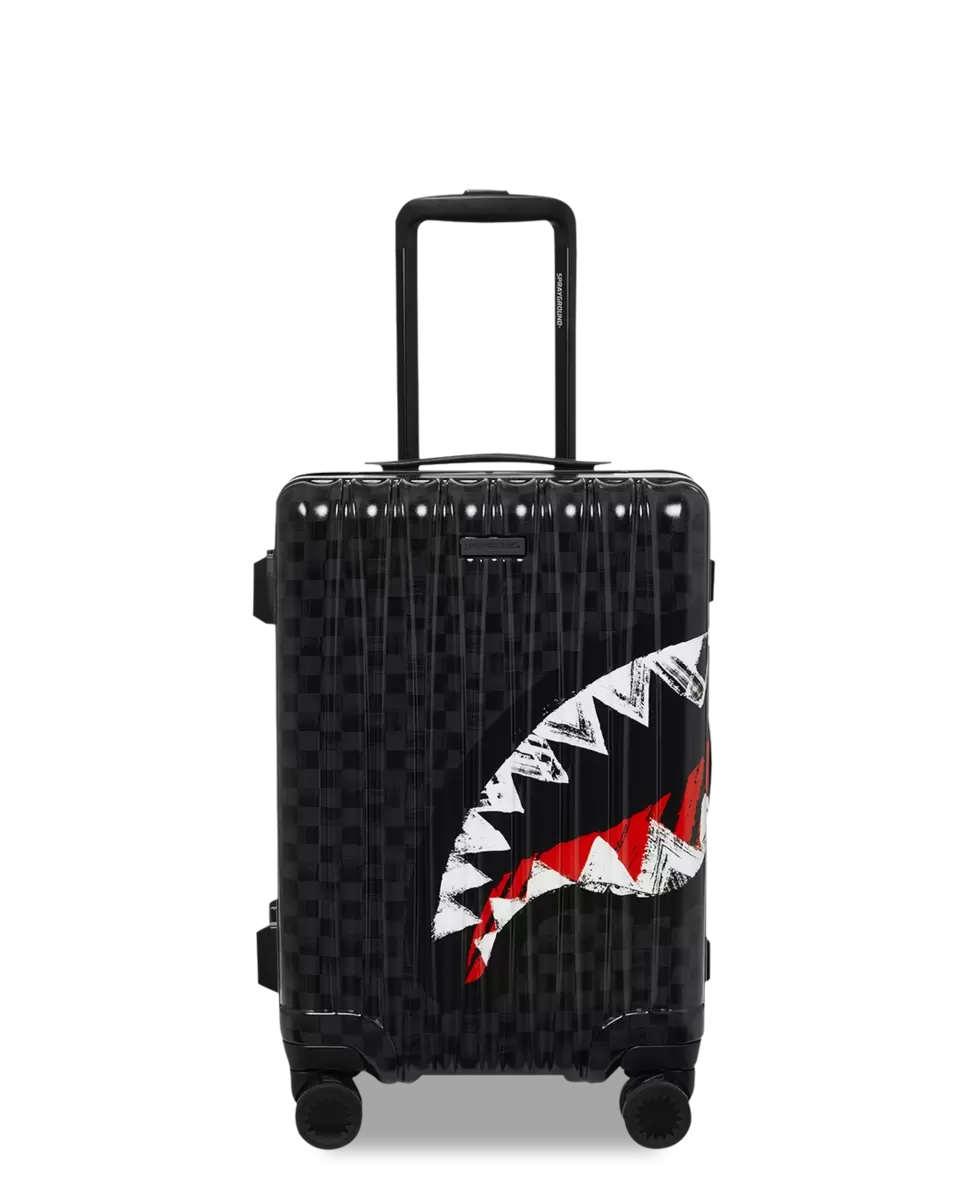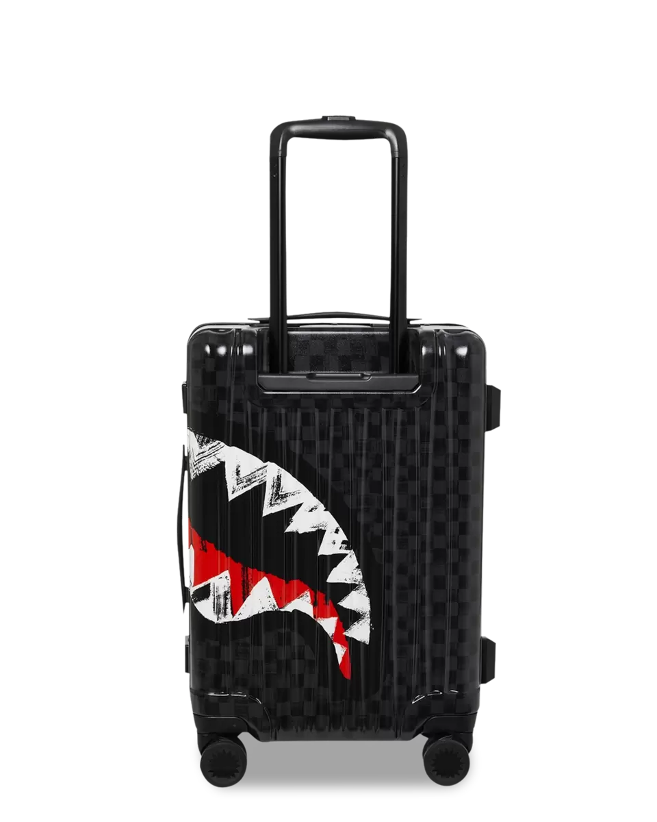 BAGAGLIO A MANO 22″ DETTAGLI DEL PRODOTTO ESTERNO: SCULTURA DI SQUALO BREVETTATA N. D852504, D854321 Guscio in policarbonato al 100% resistente e indistruttibile Approvato TSA Dimensioni con ruote: A: 21,5″ x L: 13,74″ x P: 8,66″* Serrature di sicurezza TSA Telaio in lega di alluminio senza cerniera 4 doppie ruote girevoli incassate Maniglia telescopica regolabile INTERNO: Molteplici tasche e scomparti per la massima organizzazione Fodera in raso con stampa di denaro Tasche organizer in rete Cinghie di fissaggio Cerniere in nylon con hardware in metallo