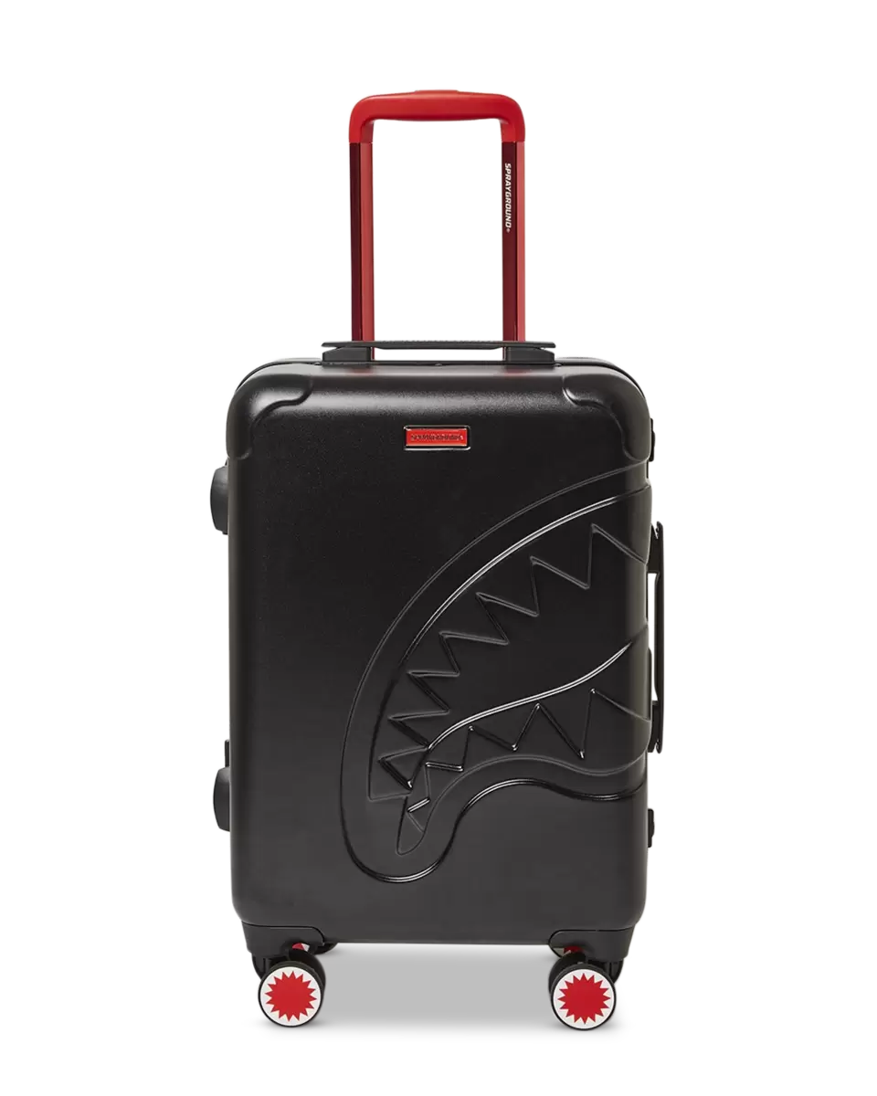 BAGAGLIO A MANO 22″ DETTAGLI DEL PRODOTTO ESTERNO: SCULTURA DI SQUALO BREVETTATA N. D852504, D854321 Guscio in policarbonato al 100% resistente e indistruttibile Approvato TSA Dimensioni con ruote: A: 21,5″ x L: 13,74″ x P: 8,66″* Serrature di sicurezza TSA Telaio in lega di alluminio senza cerniera 4 doppie ruote girevoli incassate Maniglia telescopica regolabile INTERNO: Molteplici tasche e scomparti per la massima organizzazione Fodera in raso con stampa di denaro Tasche organizer in rete Cinghie di fissaggio Cerniere in nylon con hardware in metallo