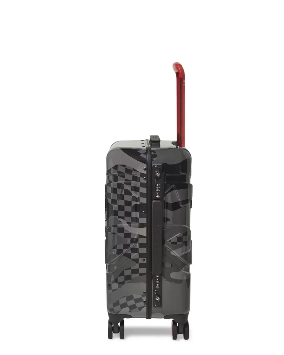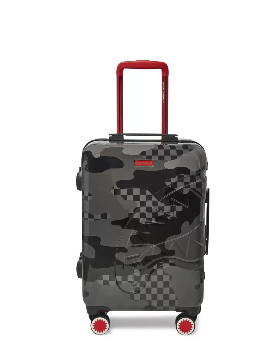BAGAGLIO A MANO 22″ DETTAGLI DEL PRODOTTO ESTERNO: SCULTURA DI SQUALO BREVETTATA N. D852504, D854321 Guscio in policarbonato al 100% resistente e indistruttibile Approvato TSA Dimensioni con ruote: A: 21,5″ x L: 13,74″ x P: 8,66″* Serrature di sicurezza TSA Telaio in lega di alluminio senza cerniera 4 doppie ruote girevoli incassate Maniglia telescopica regolabile INTERNO: Molteplici tasche e scomparti per la massima organizzazione Fodera in raso con stampa di denaro Tasche organizer in rete Cinghie di fissaggio Cerniere in nylon con hardware in metallo