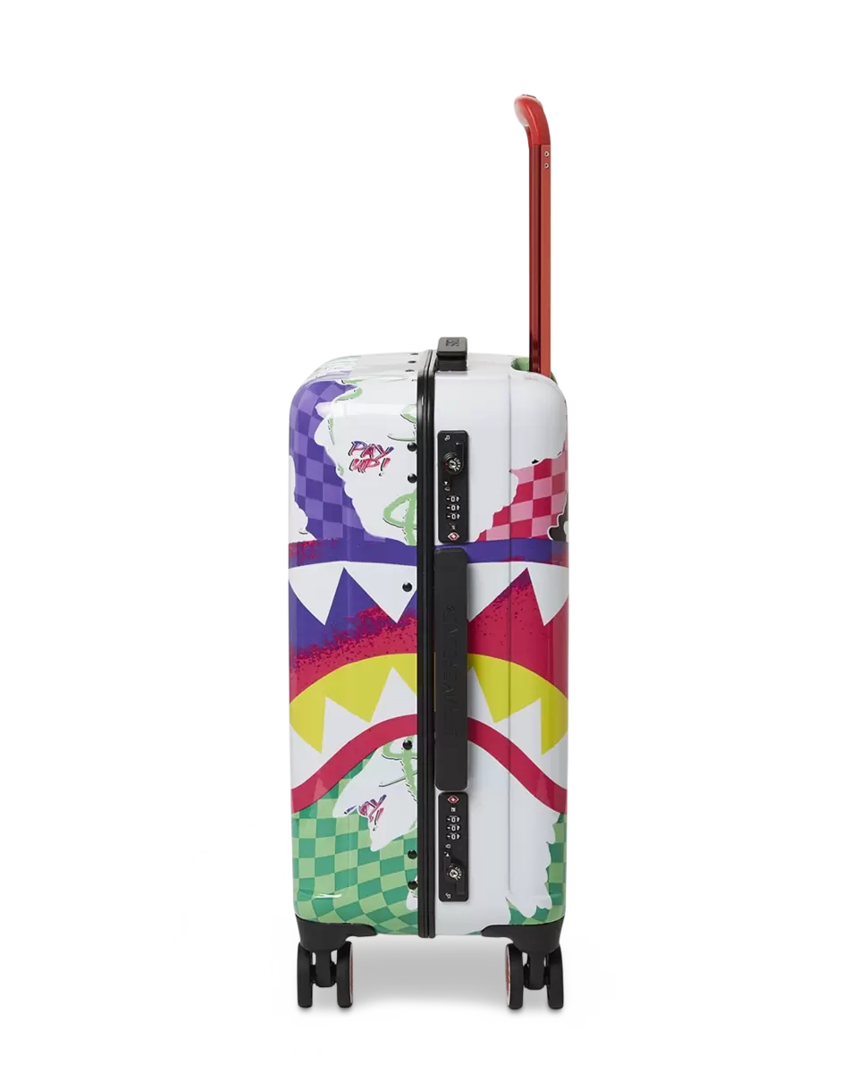 BAGAGLIO A MANO 22″ DETTAGLI DEL PRODOTTO ESTERNO: SCULTURA DI SQUALO BREVETTATA N. D852504, D854321 Guscio in policarbonato al 100% resistente e indistruttibile Approvato TSA Dimensioni con ruote: A: 21,5″ x L: 13,74″ x P: 8,66″* Serrature di sicurezza TSA Telaio in lega di alluminio senza cerniera 4 doppie ruote girevoli incassate Maniglia telescopica regolabile INTERNO: Molteplici tasche e scomparti per la massima organizzazione Fodera in raso con stampa di denaro Tasche organizer in rete Cinghie di fissaggio Cerniere in nylon con hardware in metallo