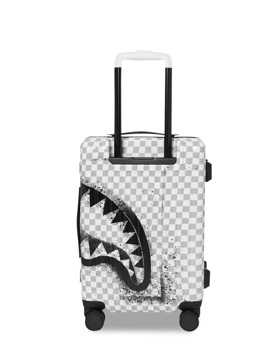 BAGAGLIO A MANO 22″ DETTAGLI DEL PRODOTTO ESTERNO: SCULTURA DI SQUALO BREVETTATA N. D852504, D854321 Guscio in policarbonato al 100% resistente e indistruttibile Approvato TSA Dimensioni con ruote: A: 21,5″ x L: 13,74″ x P: 8,66″* Serrature di sicurezza TSA Telaio in lega di alluminio senza cerniera 4 doppie ruote girevoli incassate Maniglia telescopica regolabile INTERNO: Molteplici tasche e scomparti per la massima organizzazione Fodera in raso con stampa di denaro Tasche organizer in rete Cinghie di fissaggio Cerniere in nylon con hardware in metallo