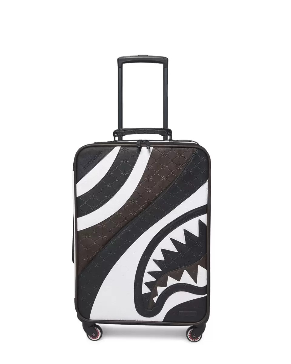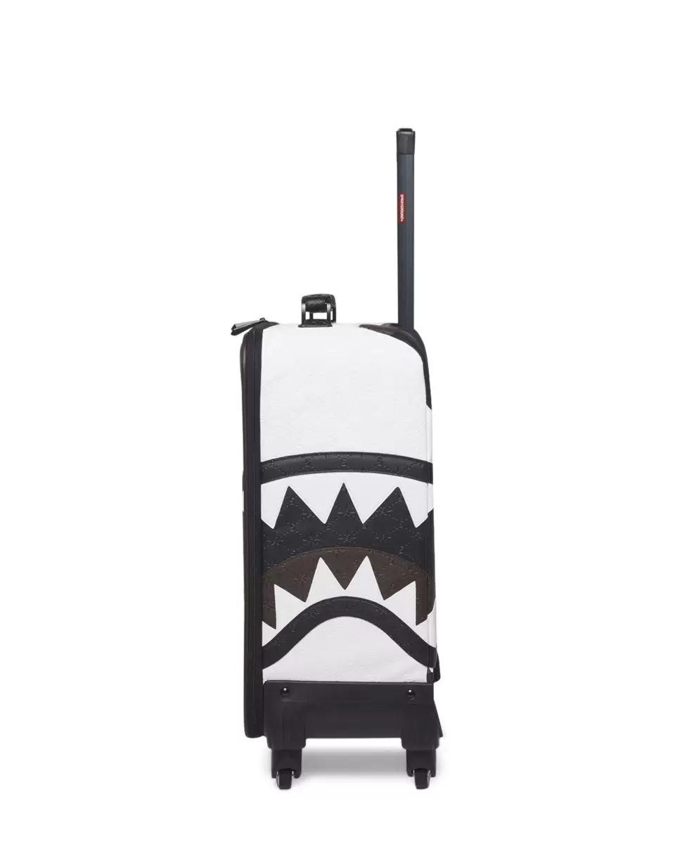 ESTERNO: Rivestimento in cloruro di polivinile al 100%, ovvero pelle vegana al 100%, altezza: 19,5″ x larghezza: 14,5″ x profondità: 7″, cerniera YKK®, tasca esterna frontale, logo in rilievo, manici superiori e laterali in similpelle, 4 doppie ruote girevoli incassate, maniglia telescopica regolabile in 2 posizioni, INTERNO: numerose tasche e scomparti per la massima organizzazione, 3 tasche con cerniera, 4 tasche in rete, fodera in raso con stampa squalo, tasche organizer in rete, cinghie di fissaggio, cerniere in nylon con hardware in metallo.