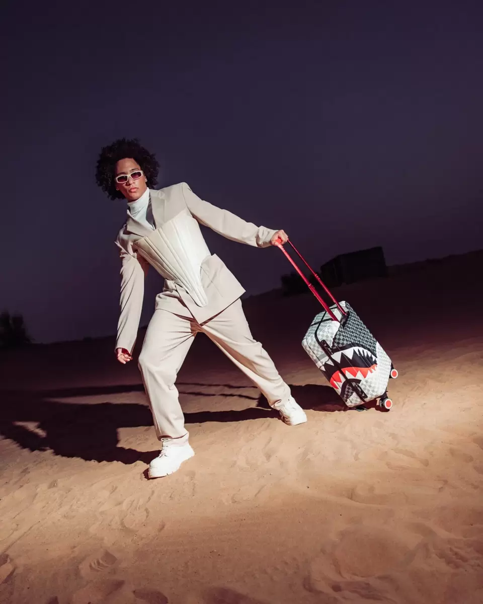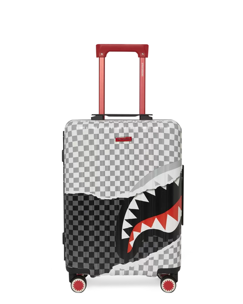 BAGAGLIO A MANO 22″ DETTAGLI DEL PRODOTTO ESTERNO: SCULTURA DI SQUALO BREVETTATA N. D852504, D854321 Guscio in policarbonato al 100% resistente e indistruttibile Approvato TSA Dimensioni con ruote: A: 21,5″ x L: 13,74″ x P: 8,66″* Serrature di sicurezza TSA Telaio in lega di alluminio senza cerniera 4 doppie ruote girevoli incassate Maniglia telescopica regolabile INTERNO: Molteplici tasche e scomparti per la massima organizzazione Fodera in raso con stampa di denaro Tasche organizer in rete Cinghie di fissaggio Cerniere in nylon con hardware in metallo