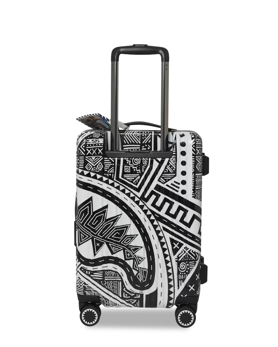 BAGAGLIO A MANO 22″ DETTAGLI DEL PRODOTTO ESTERNO: SCULTURA DI SQUALO BREVETTATA N. D852504, D854321 Guscio in policarbonato al 100% resistente e indistruttibile Approvato TSA Dimensioni con ruote: A: 21,5″ x L: 13,74″ x P: 8,66″* Serrature di sicurezza TSA Telaio in lega di alluminio senza cerniera 4 doppie ruote girevoli incassate Maniglia telescopica regolabile INTERNO: Molteplici tasche e scomparti per la massima organizzazione Fodera in raso con stampa di denaro Tasche organizer in rete Cinghie di fissaggio Cerniere in nylon con hardware in metallo