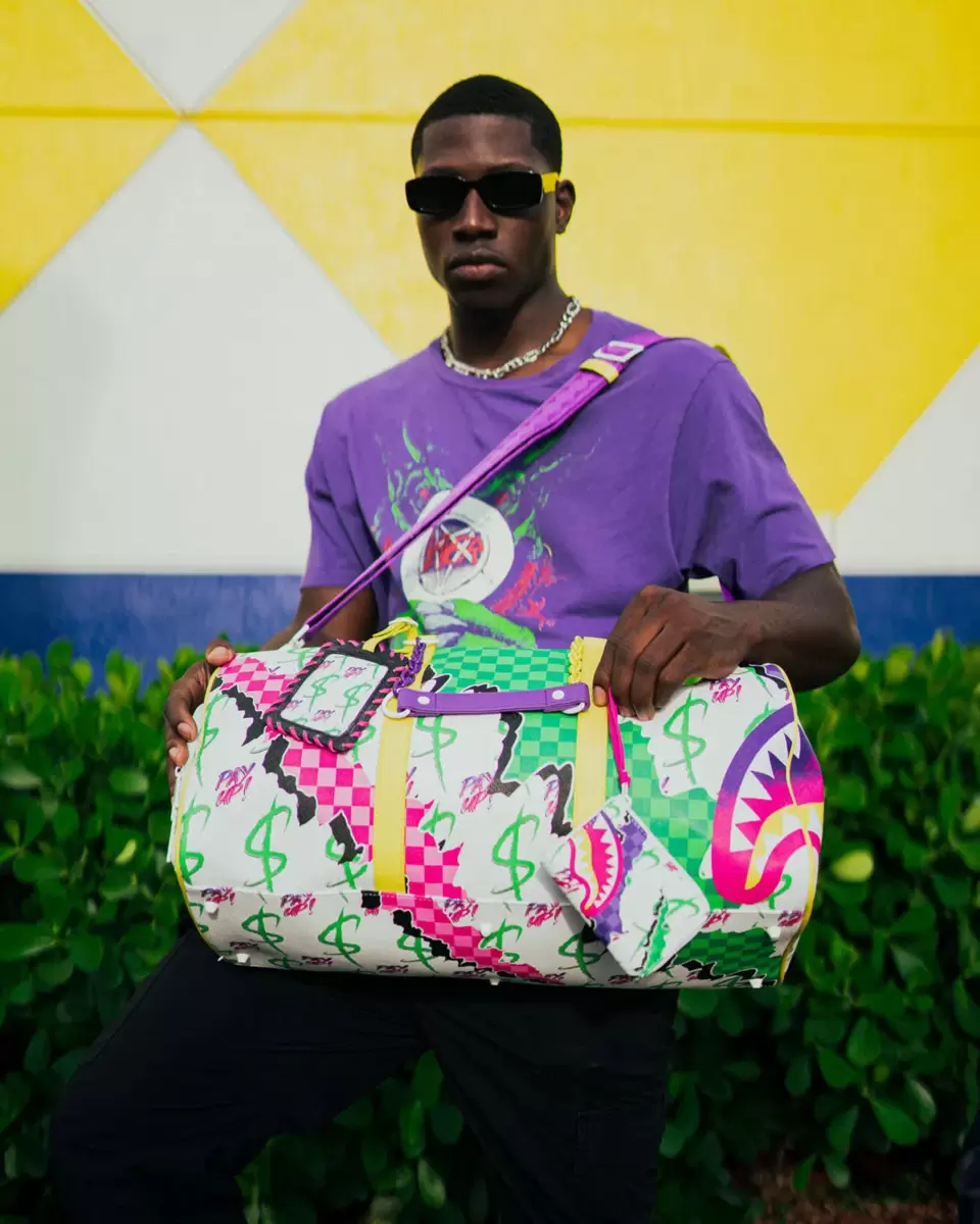 Dimensioni: 50,8 x 25,4 x 27,9 cm Tasca con cerniera in metallo Cerniere posteriori Tasca per scarpe da ginnastica con cerniera Cerniere dorate Cinghie regolabili per taglie personalizzate Cerniere in metallo con hardware in metallo Borsa di denaro Sprayground
