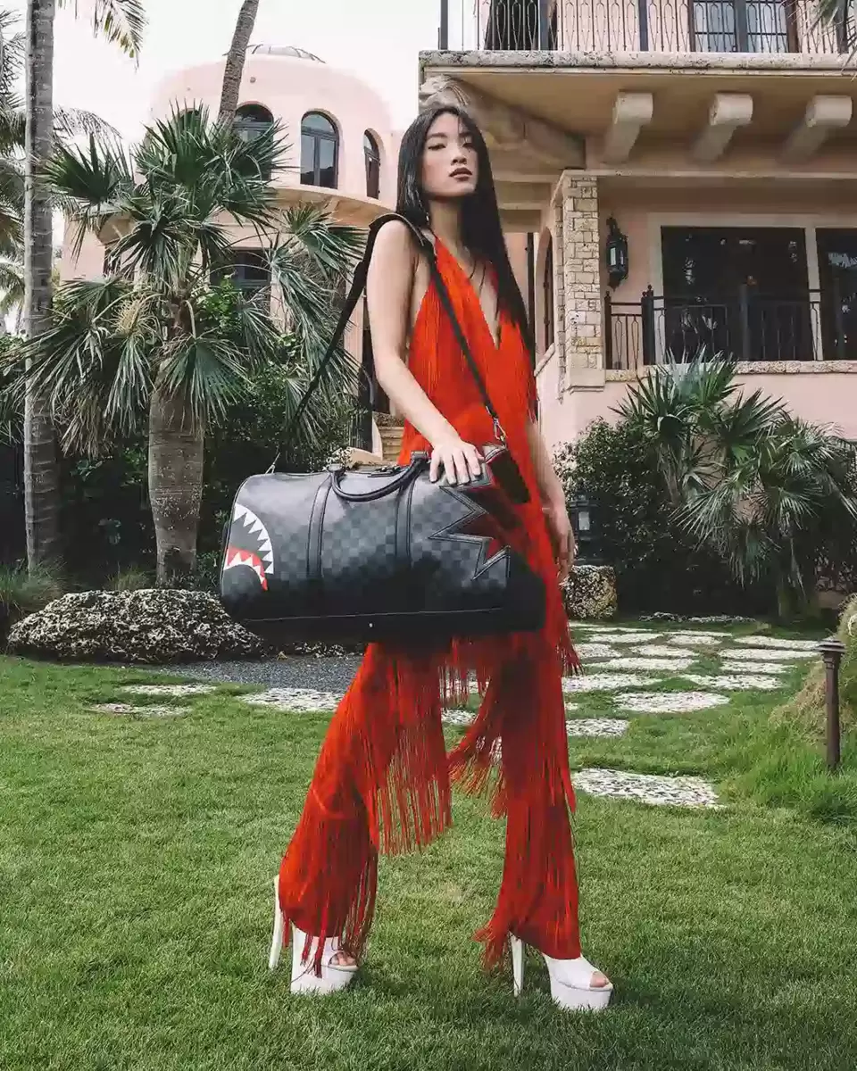 Dimensioni: 20″ x 10″ x 10,75″ Tasca con cerniera in metallo Cerniere posteriori Tasca per scarpe da ginnastica con cerniera Cerniere dorate Cinghie regolabili per taglie personalizzate Cerniere in metallo con hardware in metallo Borsa di denaro Sprayground