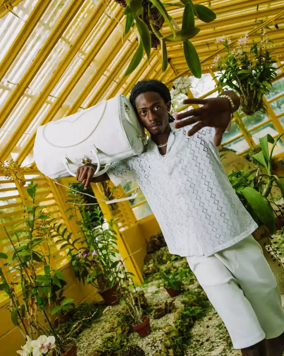 Bocca di squalo goffrata in PVC al 100% impreziosita da perle finte con hardware dorato