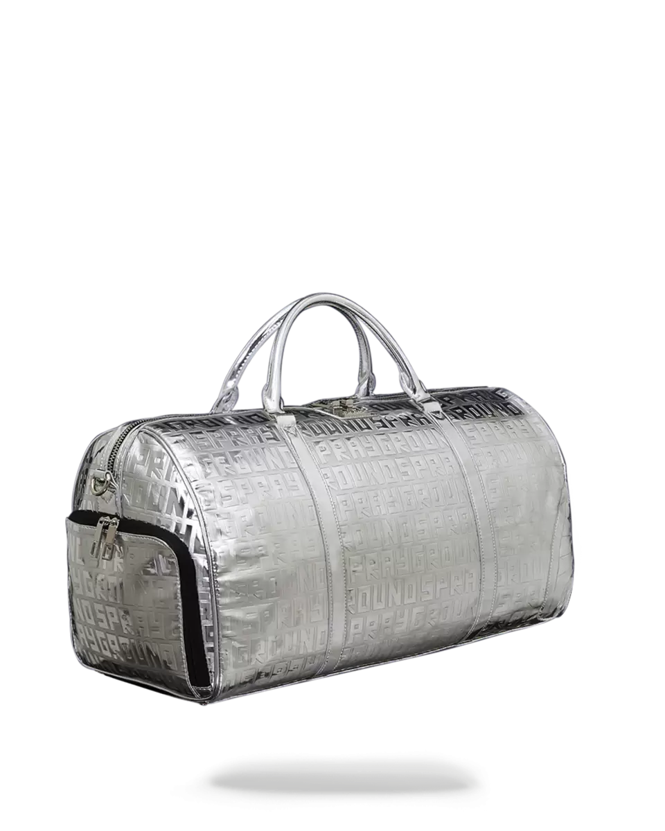 Logo Sprayground in rilievo su PU argento metallizzato con lucentezza a specchio