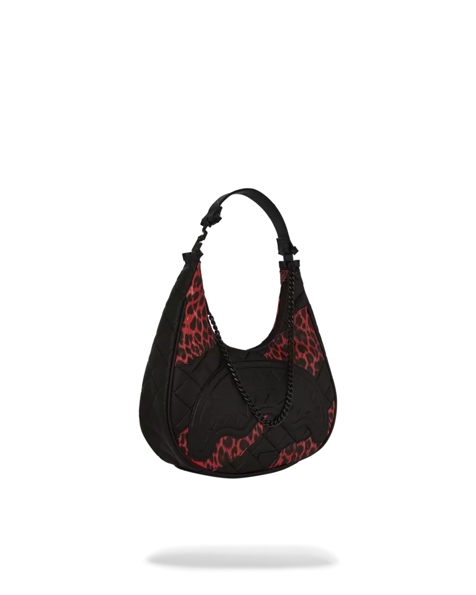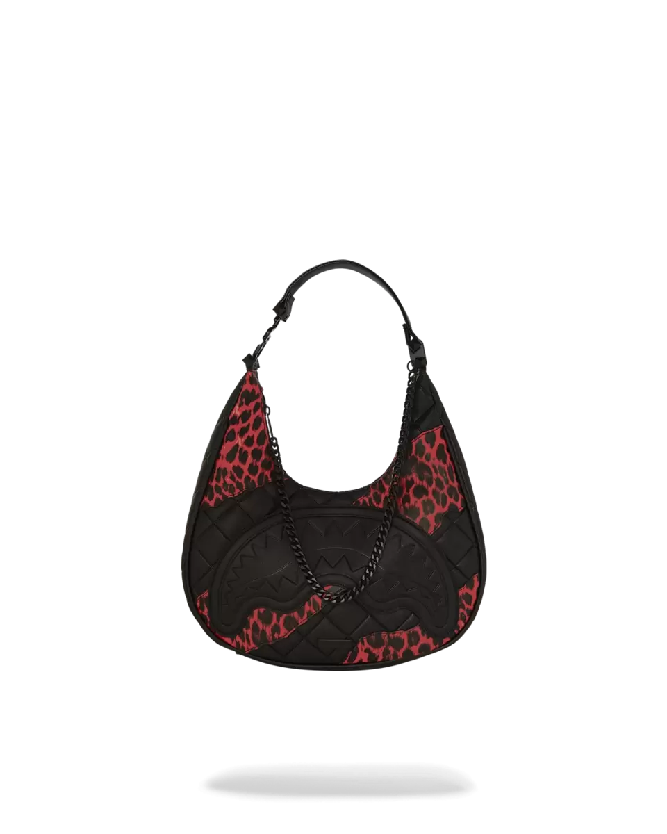 Borsa trapuntata con strappo leopardato tagliato e cucito, bocca di squalo in rilievo e tiretto con catena.