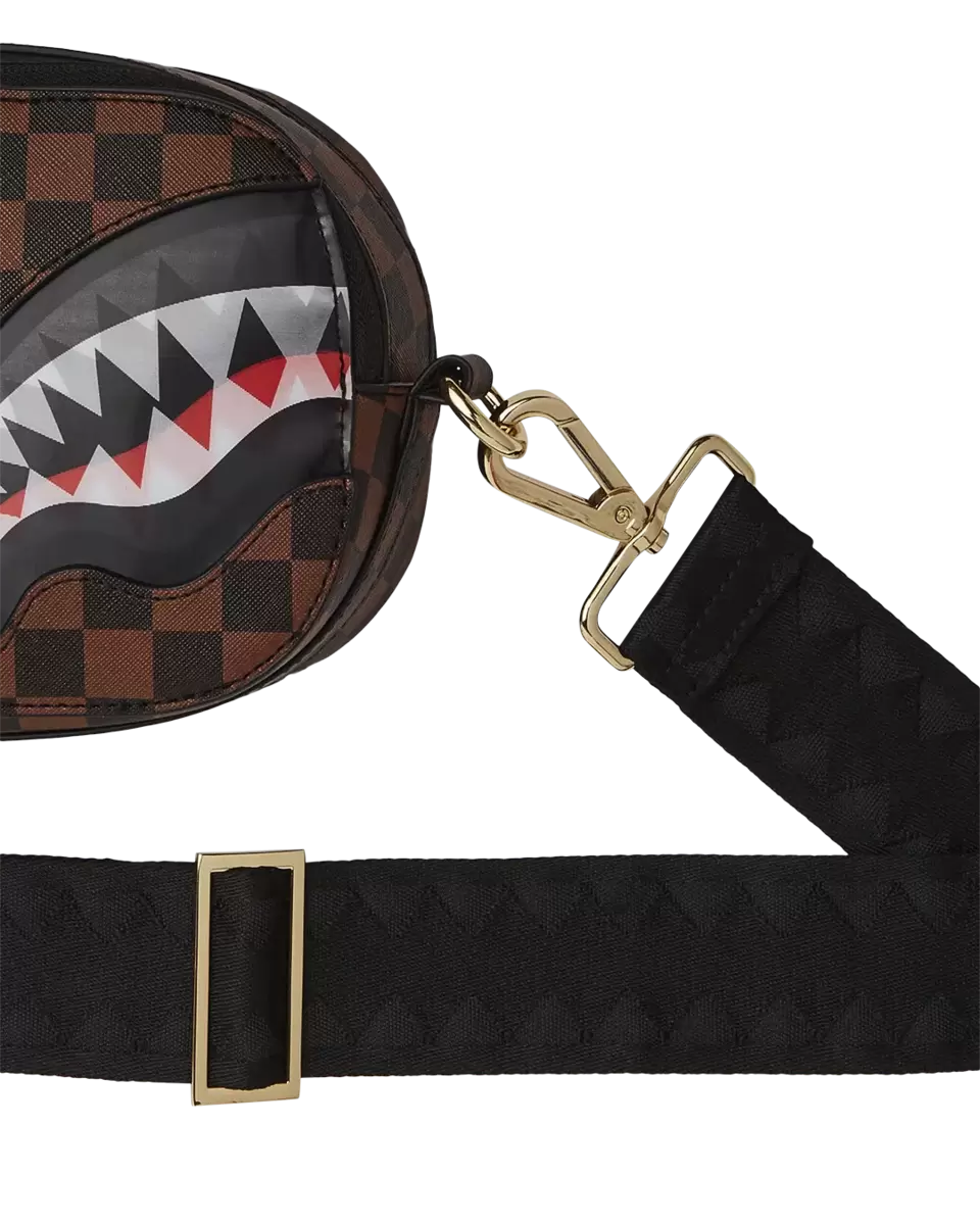 Dimensioni: A 20,3 cm x L 14 cm x P 7,6 cm 2 scomparti con cerniera Può essere indossata sulla schiena o sulla parte anteriore del corpo Cinghia regolabile in fettuccia verticale a forma di bocca di squalo