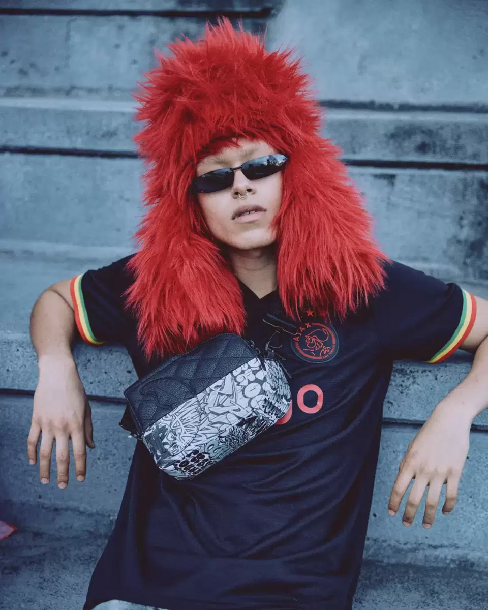 1/2 PVC trapuntato e 1/2 stampato con dettagli a forma di bocca di squalo tagliati e cuciti e hardware nero opaco