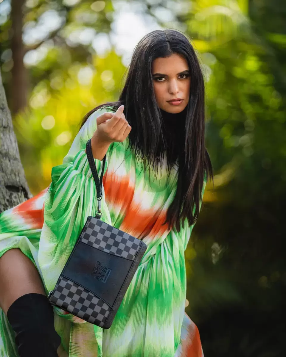 Pochette convertibile 100% ECOPELLE con cinturino da polso rimovibile, maniglia sul pannello frontale, chiusura con cerniera, 1 tasca interna, 7, X 10, X 0,25,