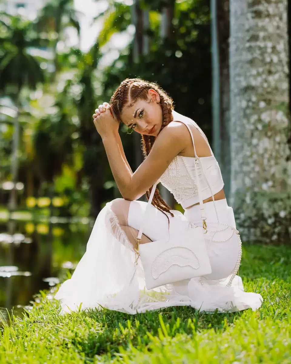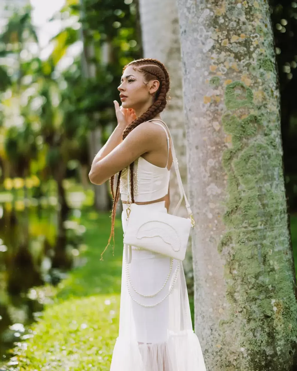 Bocca di squalo goffrata in PVC al 100%, impreziosita da perle finte e finiture dorate