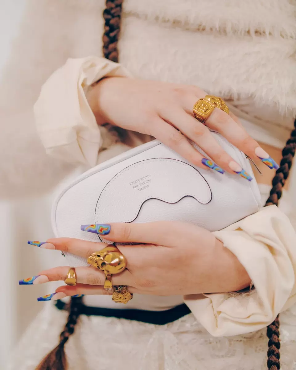 Forma di bocca di squalo tagliata e cucita con scritte in lamina d’argento in rilievo.