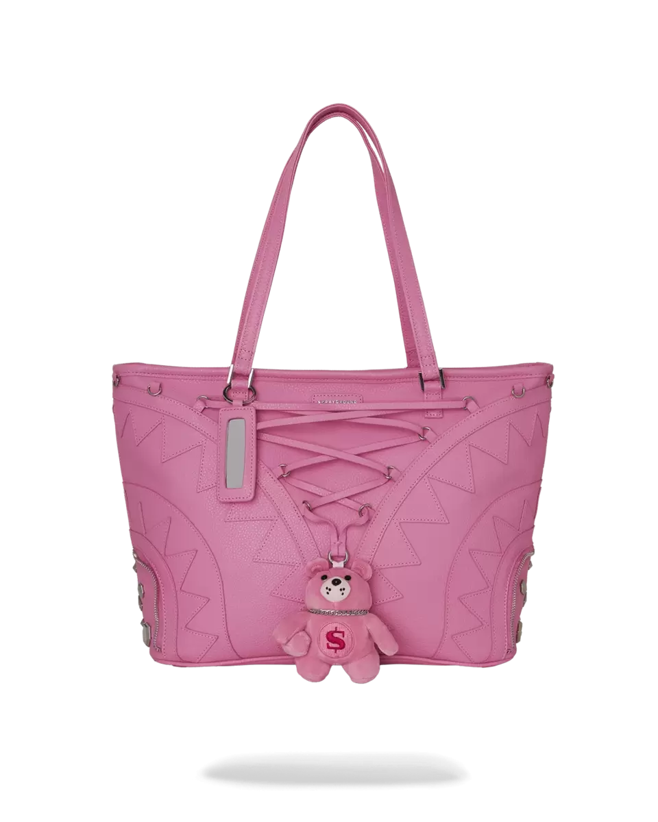 PVC con doppio taglio e cucitura a bocca di squalo, presenta dettagli decorativi con cerniera che includono un orsetto di peluche appeso al centro, finiture in PVC con lacci, pannelli laterali decorati con borchie in metallo argentato e un portachiavi a specchio appeso