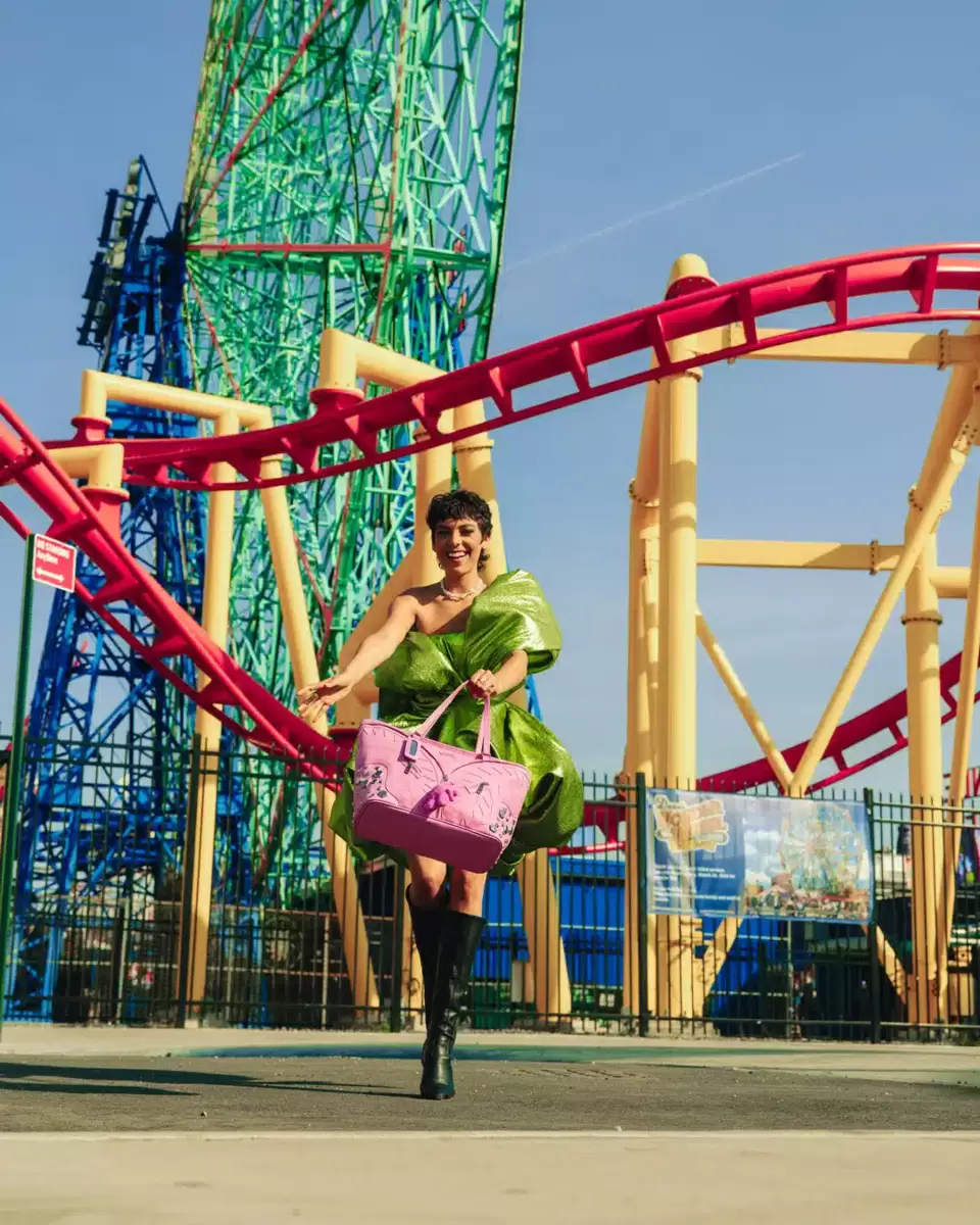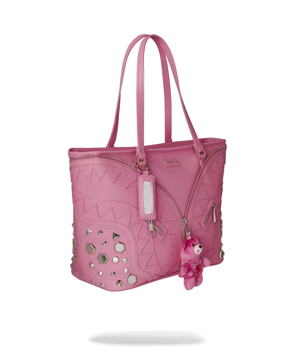 PVC con doppio taglio e cucitura a bocca di squalo, presenta dettagli decorativi con cerniera che includono un orsetto di peluche appeso al centro, i pannelli laterali sono decorati con borchie in metallo argentato e un portachiavi a specchio appeso