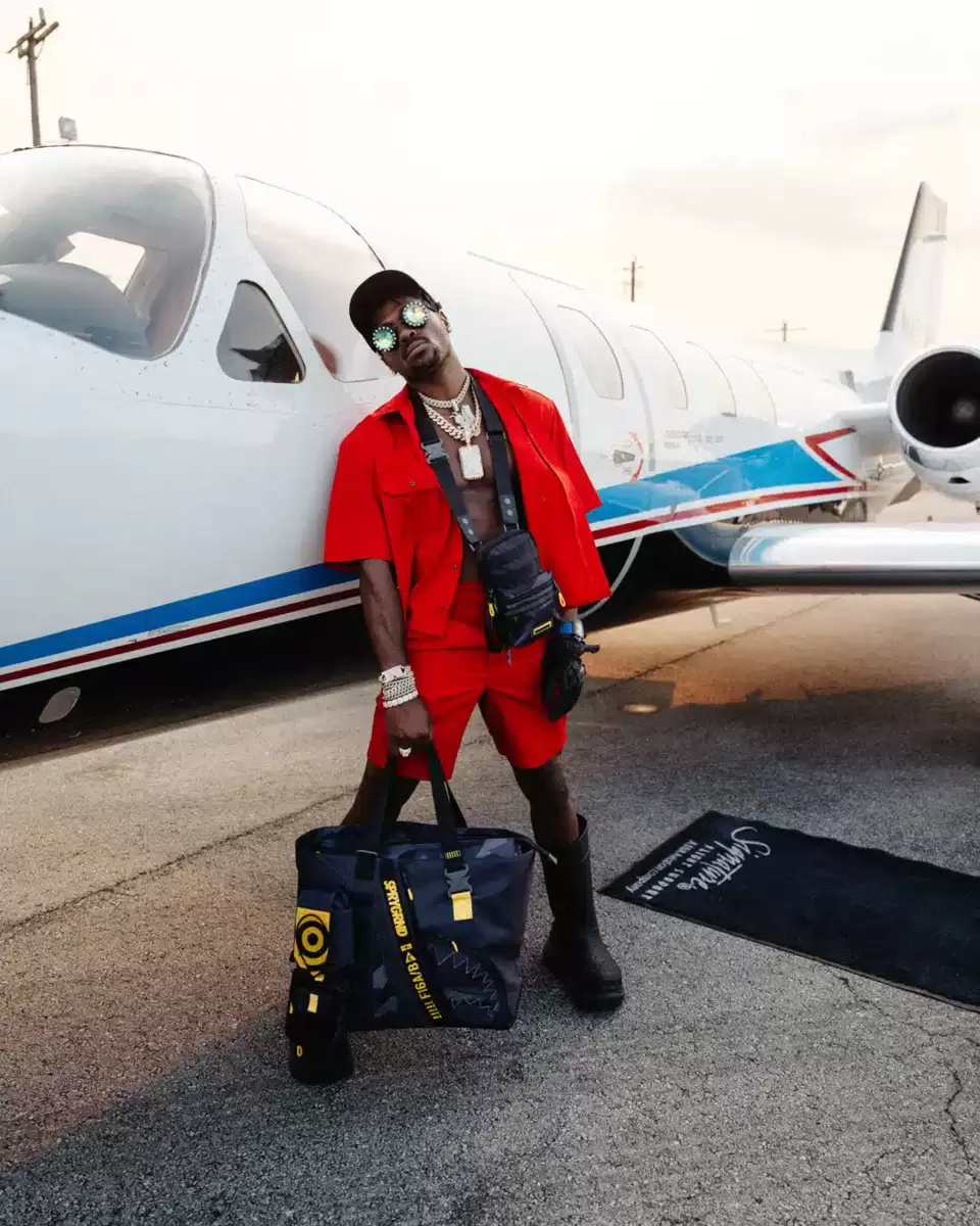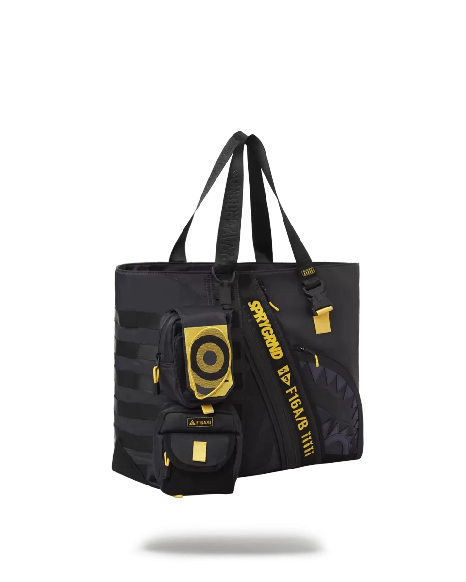 Tessuto in raso di poliestere con dettagli mimetici monocromatici e finiture gialle a contrasto