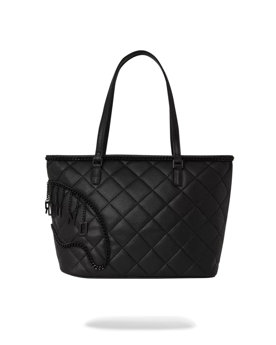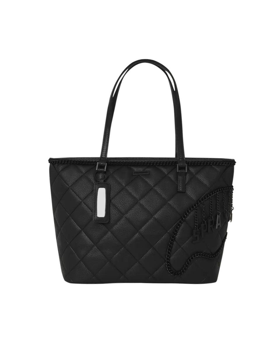100% PVC, similpelle nera trapuntata con catena nera e logo pendente.