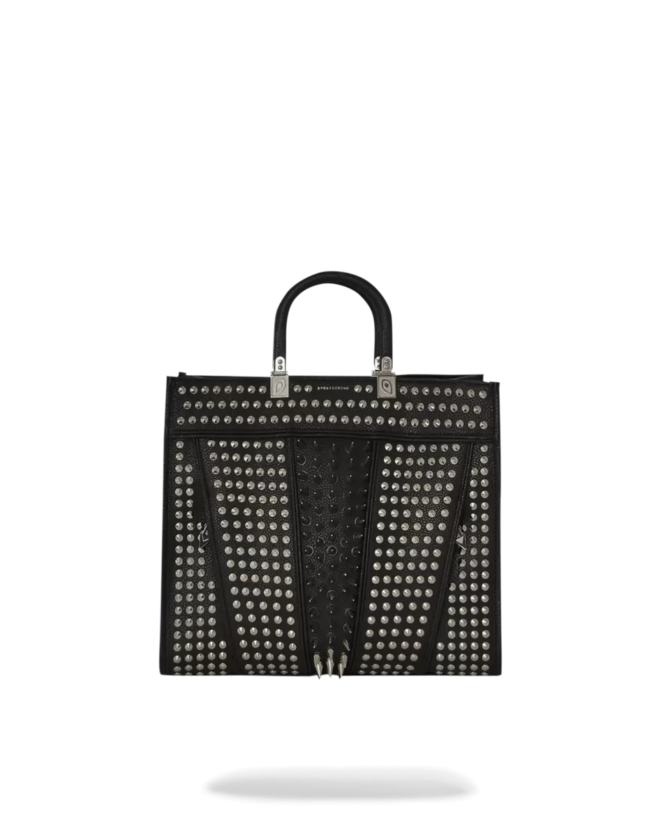 Pelle PVC con punte e borchie in metallo su tutta la superficie, manici con puntine in metallo e manico rivestito in PVC, tracolla agganciabile con altre punte e borchie