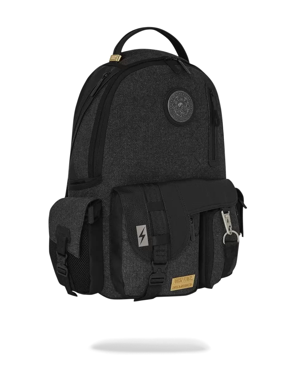 COLLABORAZIONE UFFICIALE CON JOHN WICK Tessuto a spina di pesce con dettagli cargo utility. Impreziosito dall’iconico emblema della moneta John Wick, Quod Debtium Sanguine.