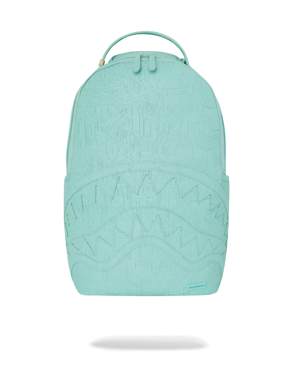 Zaino color acqua con graffiti in rilievo e bocca di squalo tagliata e cucita. Dimensioni esterne 18, x 6, x 11,5, tasca frontale con cerniera, tasche laterali, tasca portaoggetti con cerniera.