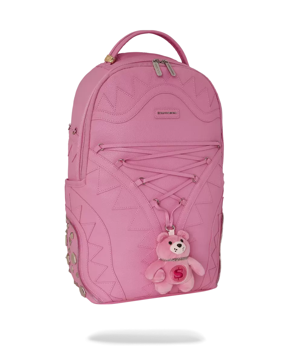 PVC con dettagli tagliati e cuciti a doppia bocca di squalo, dettagli decorativi con cerniera che includono un orsetto di peluche appeso al centro, finiture in PVC con lacci, pannelli laterali decorati