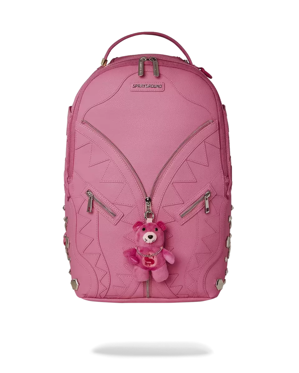 PVC con dettagli tagliati e cuciti a doppia bocca di squalo, dettagli decorativi con cerniera che includono un orsetto di peluche appeso al centro, pannelli laterali decorati con metallo argentato