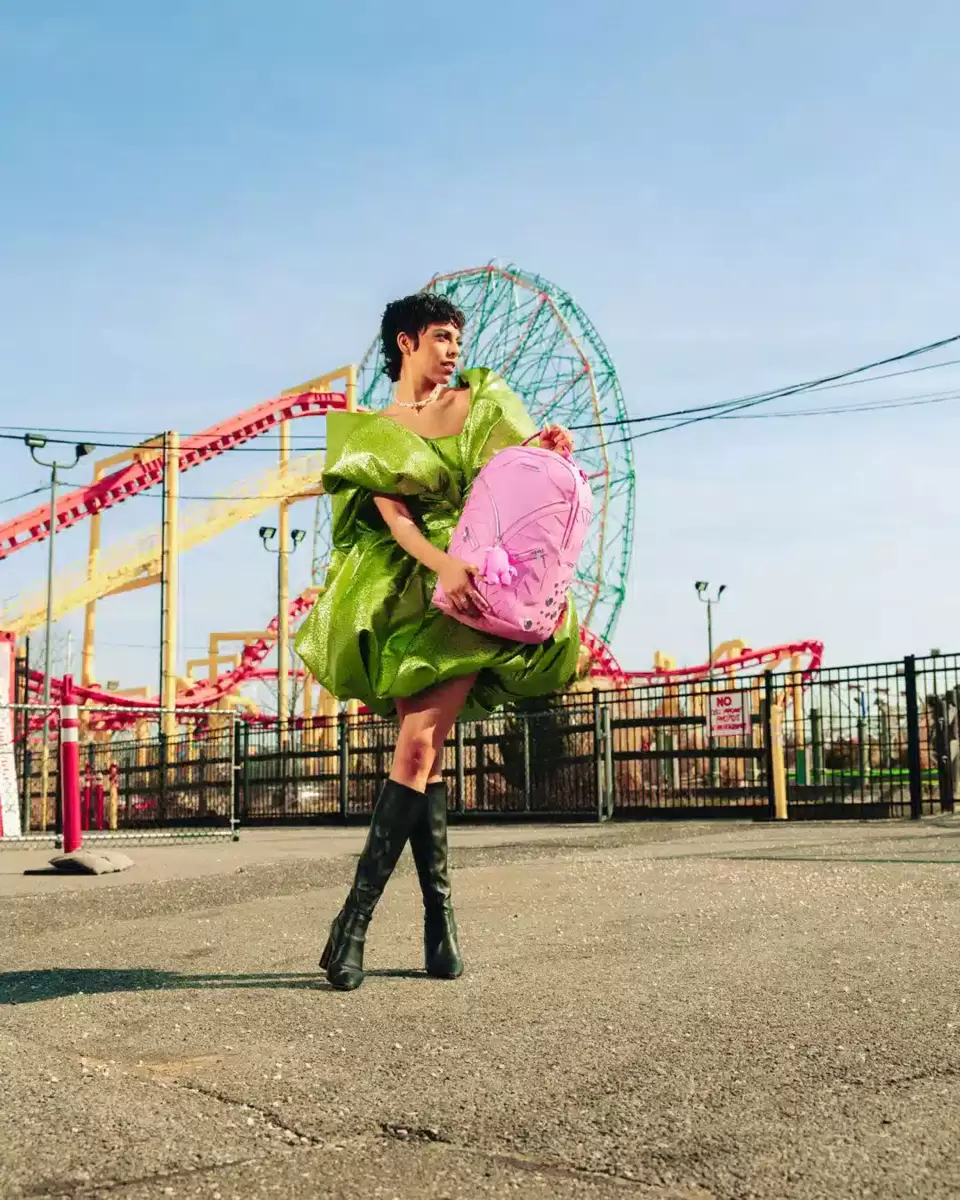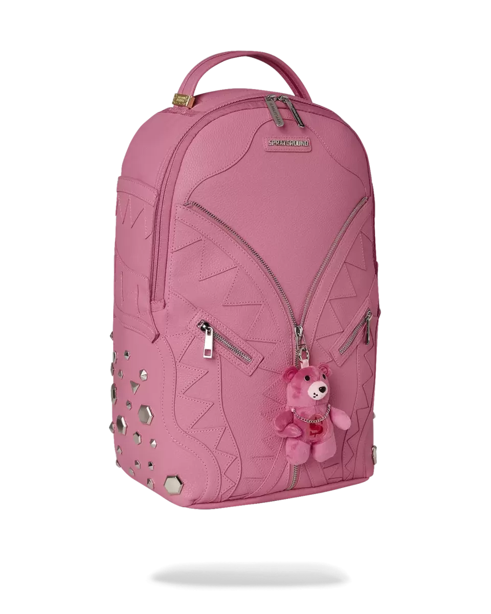 PVC con dettagli tagliati e cuciti a doppia bocca di squalo, dettagli decorativi della cerniera che includono un orsetto di peluche appeso al centro, pannelli laterali decorati con borchie in metallo argentato