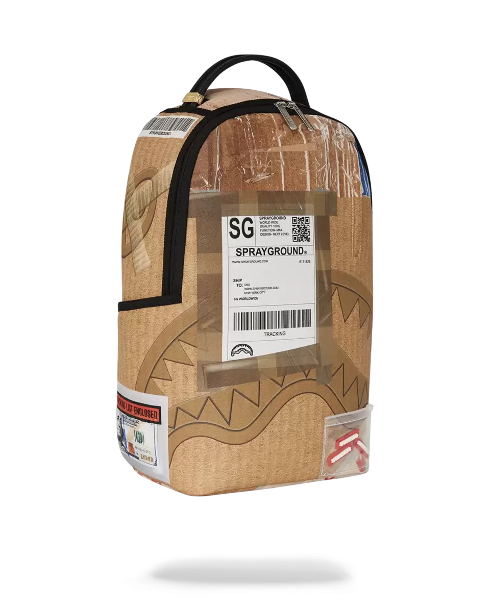 Spedisci la tua borsa in stile SPRAYGROUND! Zaino in PVC progettato per sembrare una scatola imballata. Dispone di una tasca con cerniera con emblemi SPRAYGROUND extra per la decorazione.