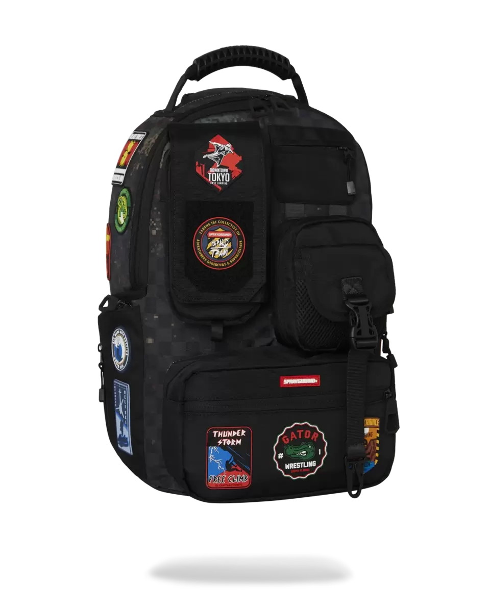 Dettagli tattici, tasche multifunzionali, toppe e fibbie personalizzate, tessuto in nylon resistente, pannello posteriore a forma di squalo personalizzato