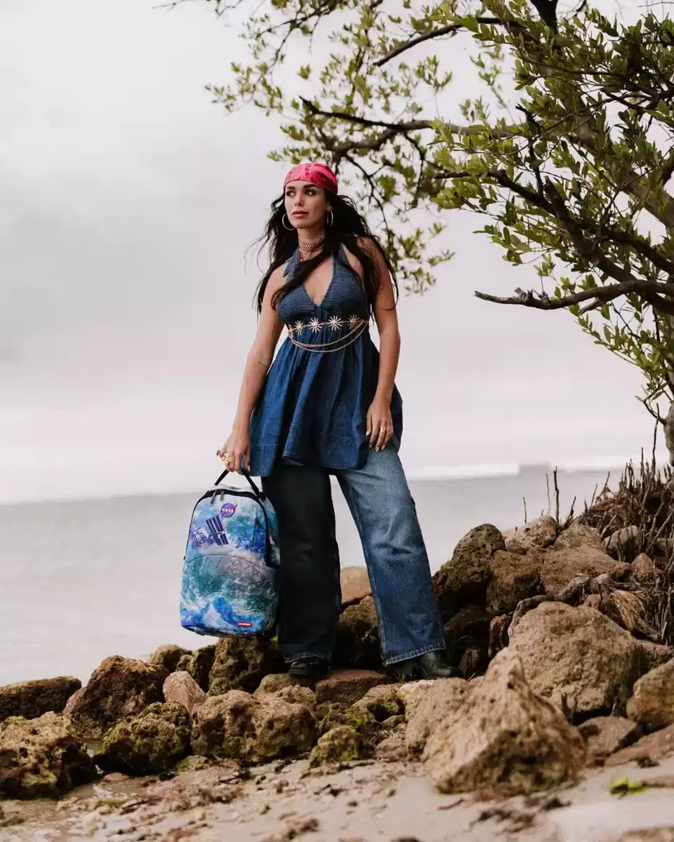 Dimensioni: 45,7 x 15,2 x 29,7 cm Tasca frontale con cerniera Tasche laterali Tasca portaoggetti con cerniera Scomparto separato in velluto per occhiali da sole Imbottitura posteriore ergonomica in rete Cinghie regolabili per una vestibilità personalizzata Cerniere dorate con ferramenta in metallo Stemma “Sprayground Authentic” in metallo La tasca posteriore scorrevole si collega al bagaglio a mano per avere le mani libere