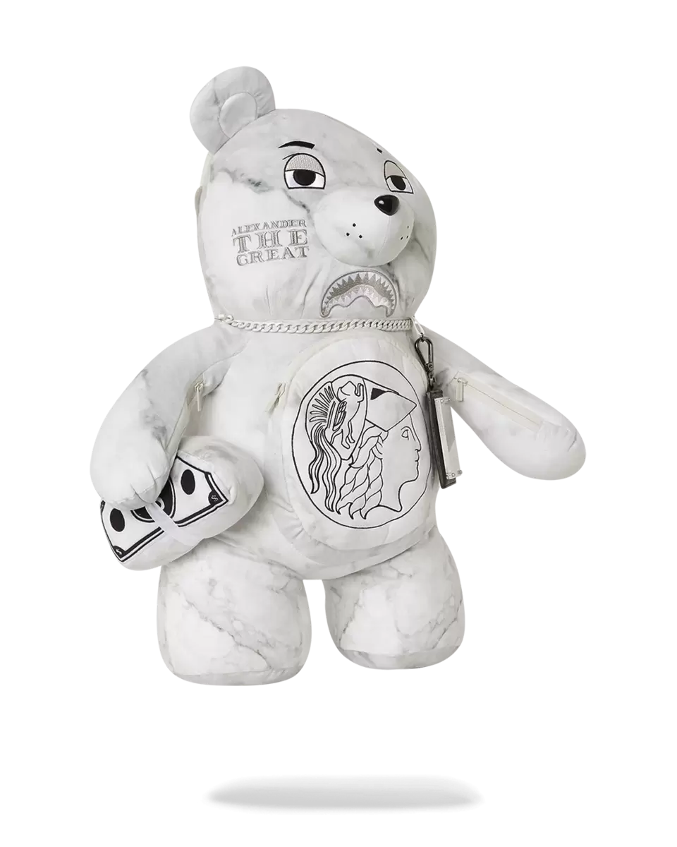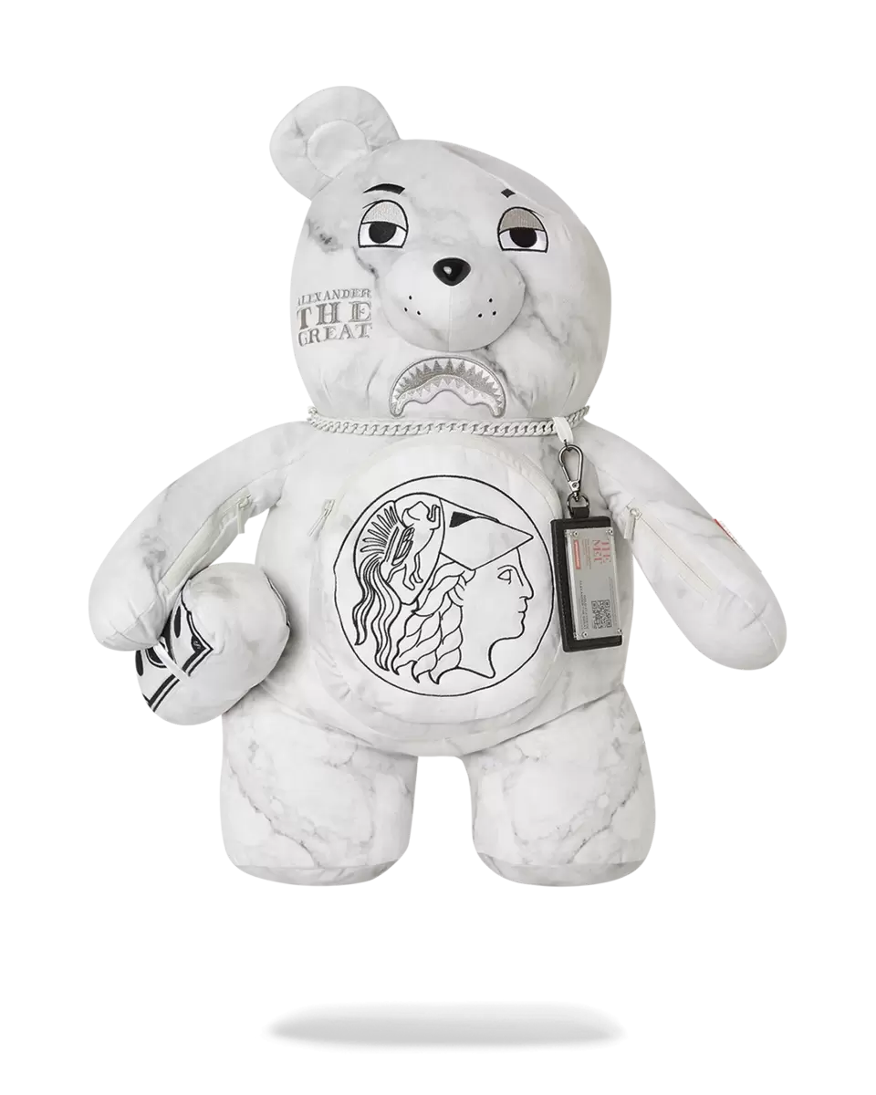 Il nostro esclusivo zaino Money Bear si rinnova in stile Met grazie a Sprayground. Evocando un’antica scultura, questo zaino a forma di orso presenta l’immagine di una moneta macedone (336-323 a.C.) coniata in nome di Alessandro Magno e ora nella collezione d’arte greca e romana del Museo. La moneta d’oro originale presenta la testa di Atena su un lato e di Nike sull’altro, entrambe dee associate alla vittoria in guerra.