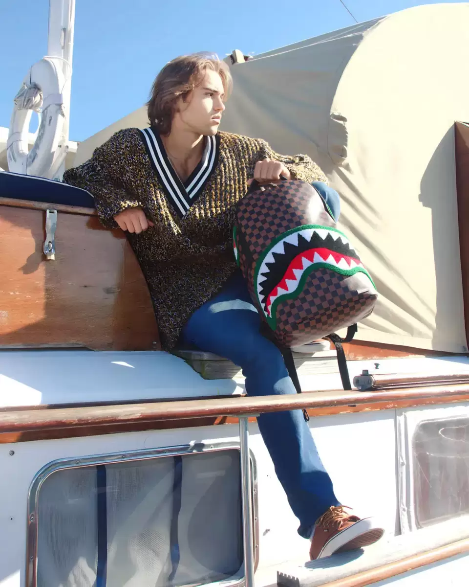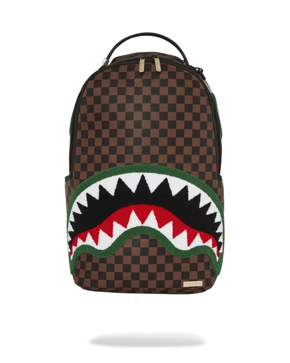 100% PVC Motivo a quadri Sharks in Paris su materiale in PVC con bocca di squalo in ciniglia testurizzata sulla parte superiore con hardware dorato