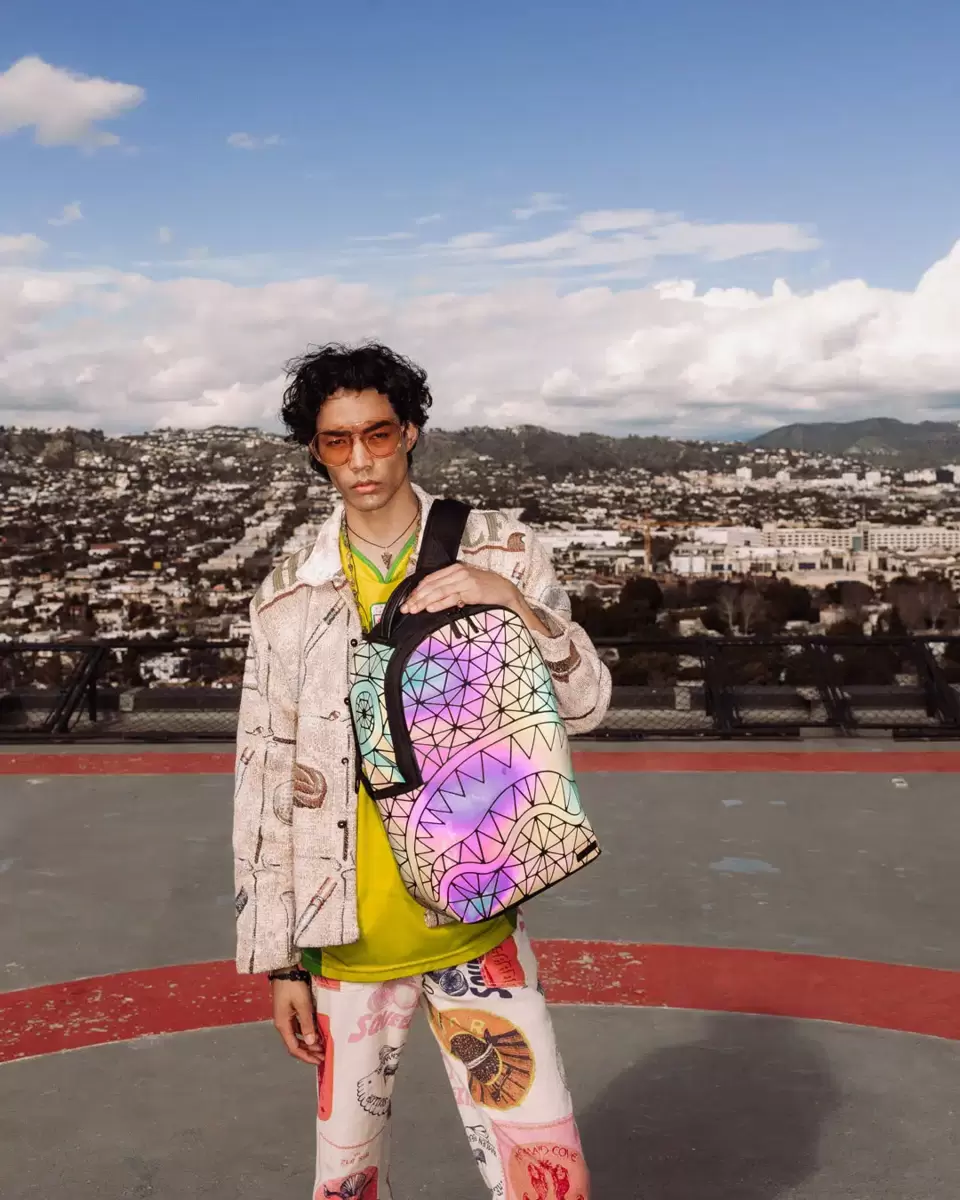 Dimensioni: 45,7 x 15,2 x 29,7 cm Tasca frontale con cerniera Tasche laterali Tasca portaoggetti con cerniera Scomparto separato in velluto per occhiali da sole Imbottitura posteriore ergonomica in rete Cinghie regolabili per una vestibilità personalizzata Cerniere dorate con ferramenta in metallo Stemma “Sprayground Authentic” in metallo La tasca posteriore scorrevole si collega al bagaglio a mano per avere le mani libere
